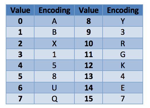 2. Use the integer value of the first 4 bits to get the first encoded character (for h, the first 4 bits are 0110, or 6, which maps to U from the table).